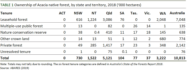 Acacia forests are located in all Australian states and the Northern Territory (Map 1). They grow mainly in arid and semi-arid regions. A total of 5.1 million hectares (47%) of the Acacia forest type is in Queensland and 3.2 million hectares (30%) are in Western Australia.