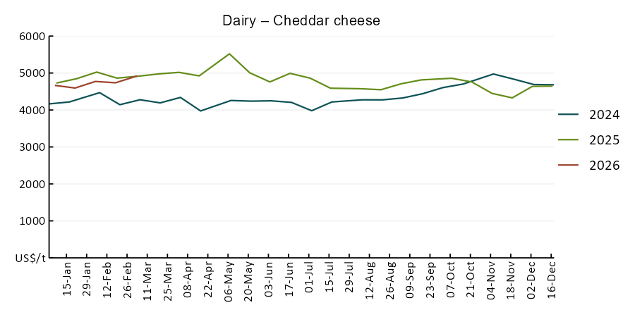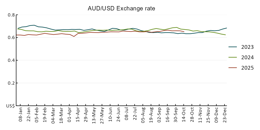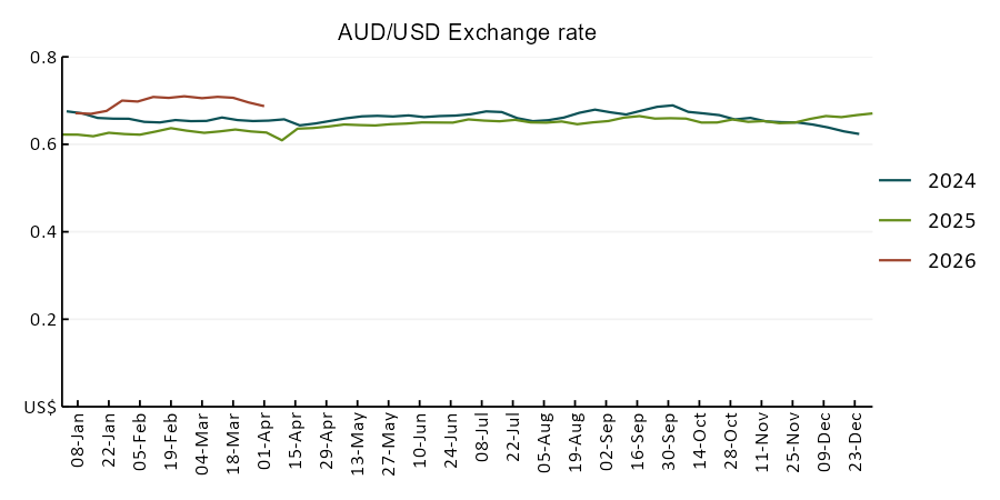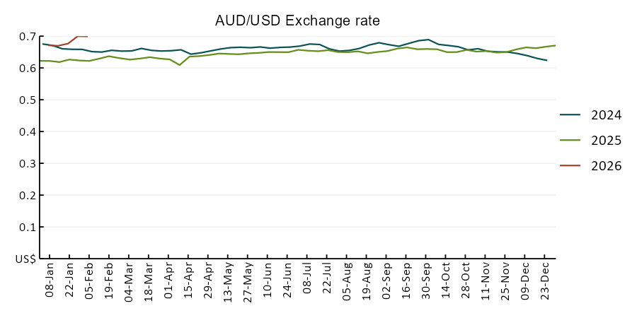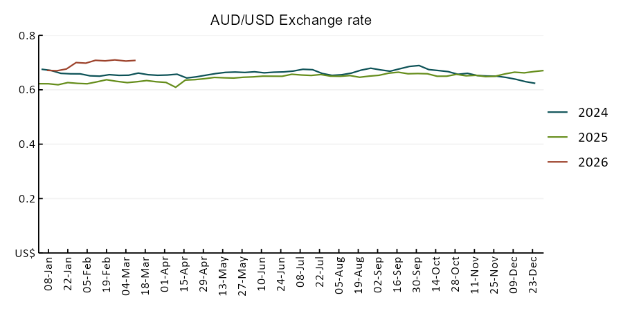 Click chart image to expand.Australian-United States exchange rateWheatCornCanolaCottonSugarWool - Eastern MarketWool - Western MarketDairy - Whole milk powderDairy - Skim milk powderDairy - Cheddar cheeseDairy - Anhydrous milk fatSources: See data attribution