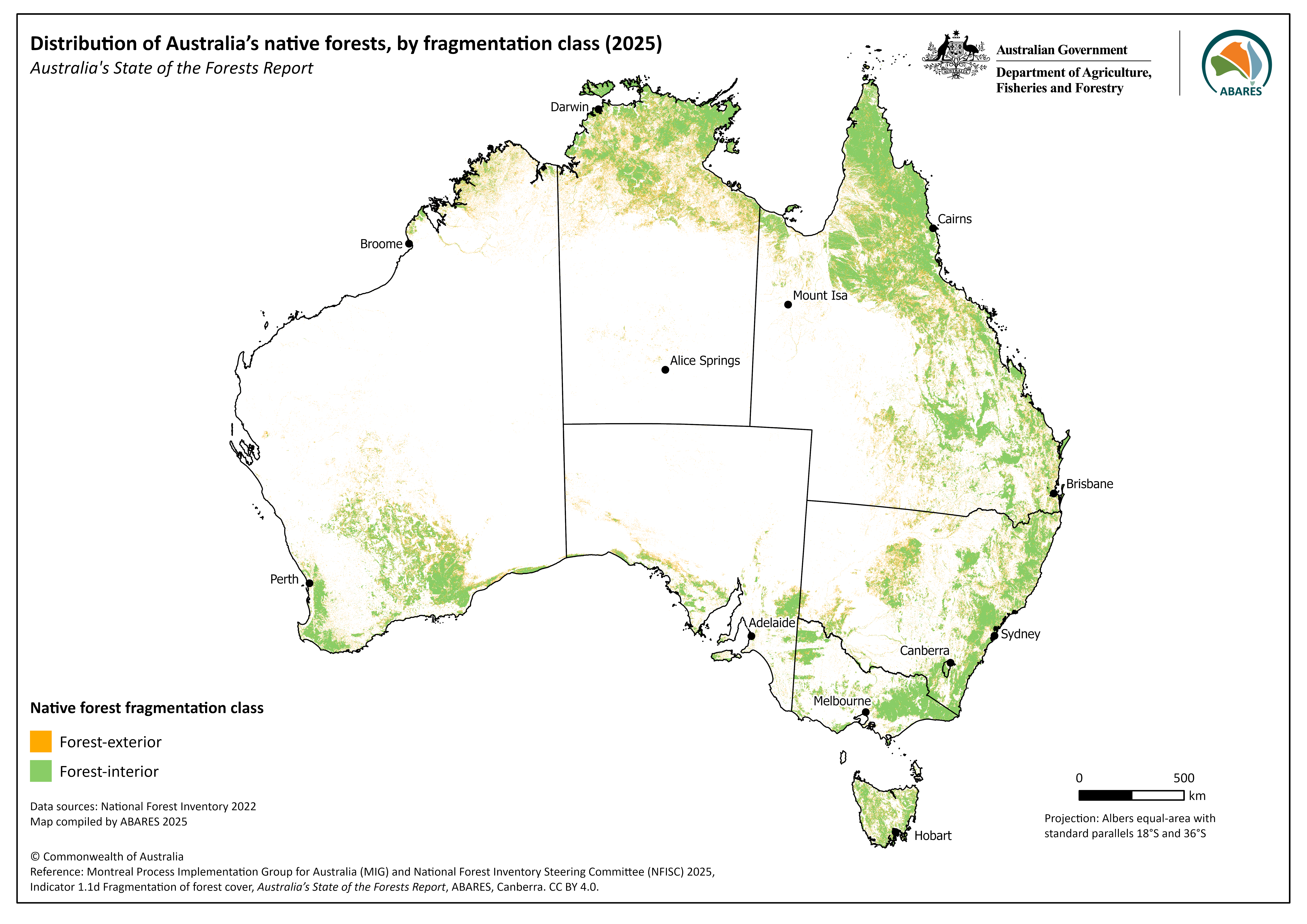 - Most of Australia’s native forest cover is continuous, not fragmented