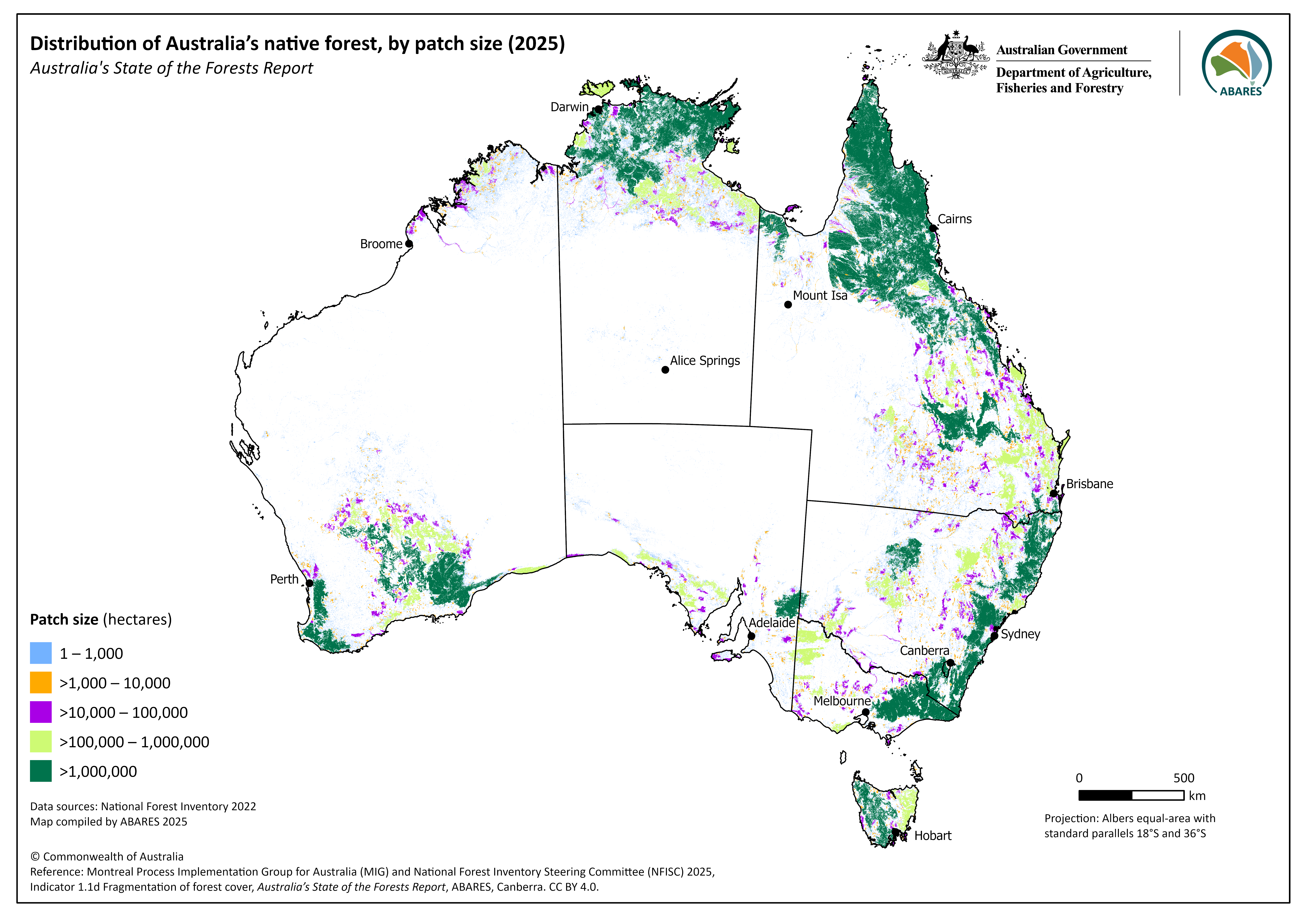 - 53% of Australia’s native forest is in patch sizes of over 1 million hectares