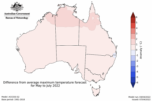 The temperature outlook for May to July 2022 indicates that maximum temperatures across most of Australia are likely to be close to the 1990-2012 average (-1°C to 1°C). Minimum temperatures are expected to be slightly above average for much of the northern half of Australia, and close to average for the rest of Australia (Bureau of Meteorology ‘National Climate Outlook’, 7 April 2022).