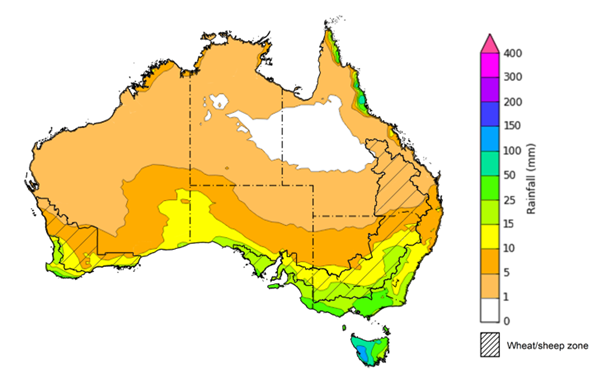 - Across cropping regions, rainfall totals of between 10 and 25 millimetres are forecast across Western Australia and New South Wales. Some regions in Victoria and South Australia are expected to receive up to 50 millimetres of rainfall, with falls of between 5 and 10 millimetres expected in most regions. If realised, this rainfall is expected to support the growth of crops and pastures in southern regions, with crops in Queensland to draw on stored soil moisture to support growth.