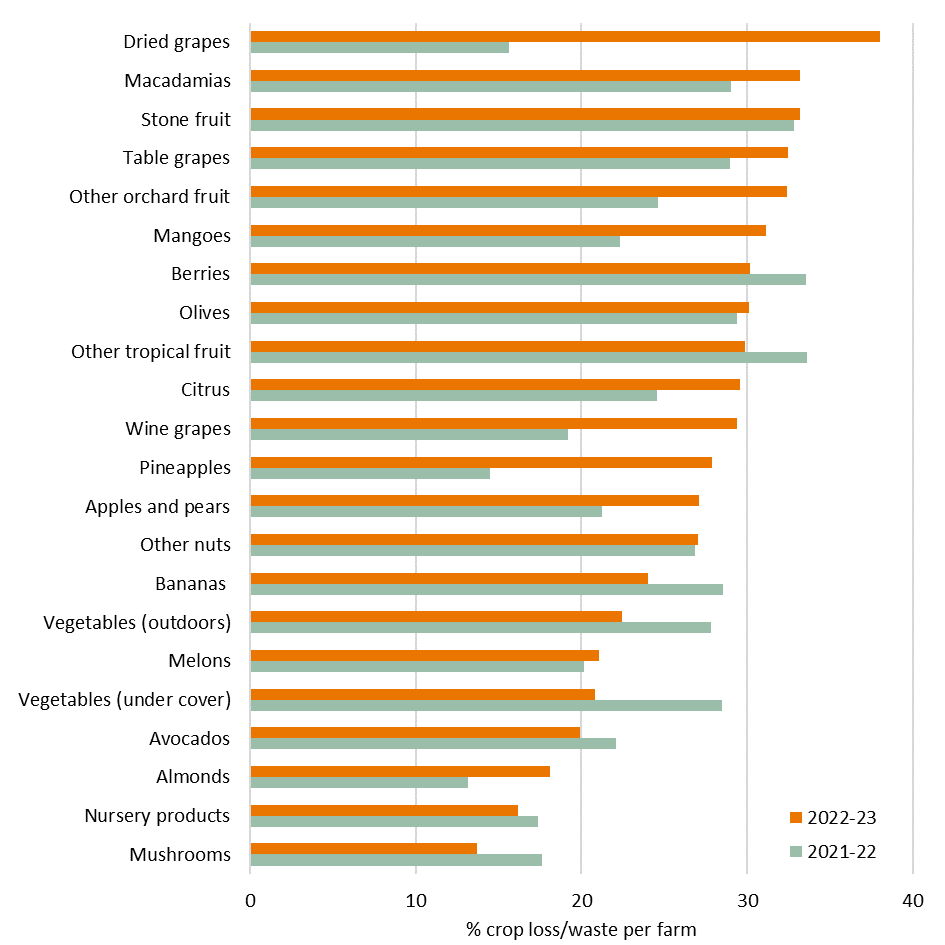 While the percentage range of crop loss/waste in 2022–23 was similar to 2021–22 (from a high of 34% to a low of 13%), some crops were impacted differently between the two years (Figure 1). For example, wet conditions associated with La Niña were a challenge for grape growers in Victoria as diseases such as downy mildew contributed to crop loss/waste of 46% per farm for dried grapes in that state (compared with 14% in 2021–22). Similarly, unseasonal winter rain caused pineapples to prematurely ripen in Queensland, resulting in crop loss/waste of 28% per farm (compared with 14% in 2021–22).