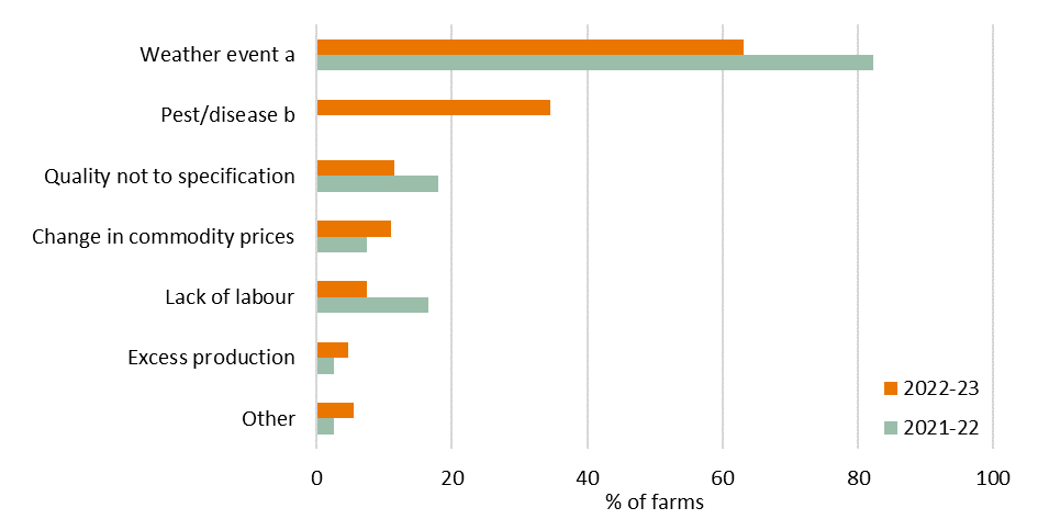 Australian horticulture farms provided information about the causes and fates of their crop loss/waste in 2022–23, with multiple responses allowed per farm. Most farms that experienced crop loss/waste in 2022–23 indicated that weather events were the primary cause of their total crop loss/waste (63% of farms), with most of this loss occurring pre-harvest and largely outside of their control (Figure 2). Other reasons for crop loss/waste in 2022–23 included pests and disease (34% of farms), quality not to specification (11%, down from 18% in 2021–22), changing commodity prices (11%, up from 7%), a lack of labour availability (7%, down from 16%) and excess production (5%, up from 3%).