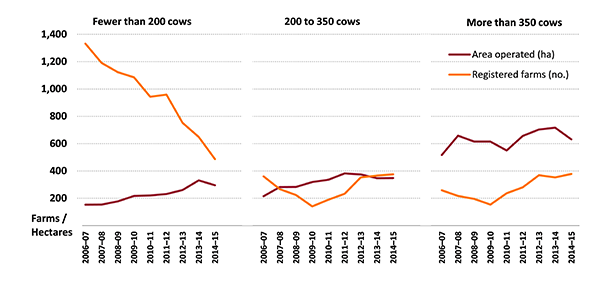 Figure 3 shows average milk production for the three herd size groups from 2006–07 to 2014–15. Average farm area increased in the group milking fewer than 200 head, but average milk production per farm declined because some of these farms diversified away from specialist milk production.In contrast to the group with fewer than 200 cows, average milk production in the group with more than 350 cows increased proportionally more than farm area. This resulted in generally higher milk production per hectare.
