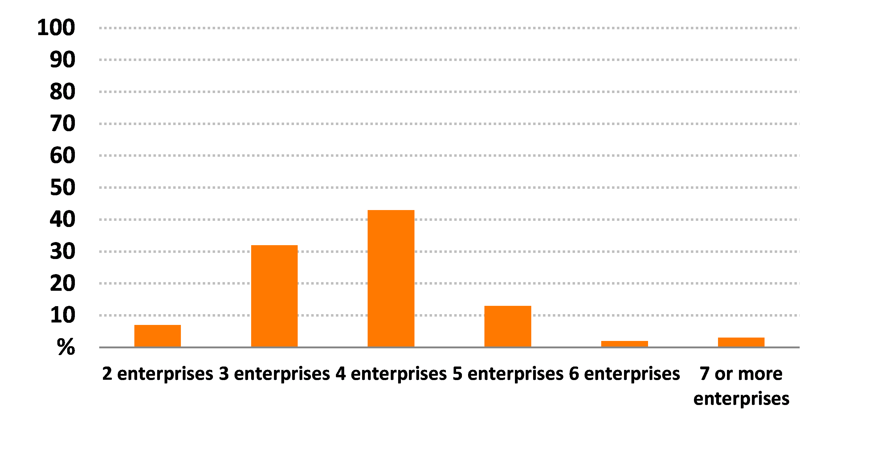 Receipts from crop sales are relatively small for dairy farmers, but the mix of crops and pasture grown is important for total water use on irrigated dairy farms. Over the period 2006–07 to 2014–15 an estimated 61 per cent of dairy farms irrigated 4 or more individual enterprises each year, including pasture, hay and various other crops. The remaining 39 per cent of farms irrigated 2 or 3 enterprises each year (Figure 4).