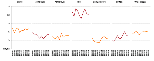 Over the period 2006–07 to 2015–16 cotton, dairy and rice farms had the widest annual variation in average water use per farm (Figure 13). Horticulture farms (citrus, pome fruit, stone fruit and grapes) had relatively small annual variation in average water use per farm. These results reflect the flexibility that cotton, dairy and rice farms have in adjusting water use according to prevailing seasonal and market conditions. Horticulture farms, in contrast, have comparatively little flexibility in adjusting water use from one year to the next.