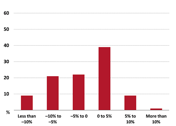 The distribution of rate of return for rice growers in 2015–16 was clustered around 0, with an estimated 53 per cent of farms recording a rate of return between 0 and –5 per cent and 19 per cent of farms with a rate of return between 0 and 5 per cent (Figure 9). The remaining 28 per cent of farms were distributed relatively evenly with 15 per cent of farms having a rate of return less than –5 per cent and 12 per cent of farms have a rate of return higher than 5 per cent.