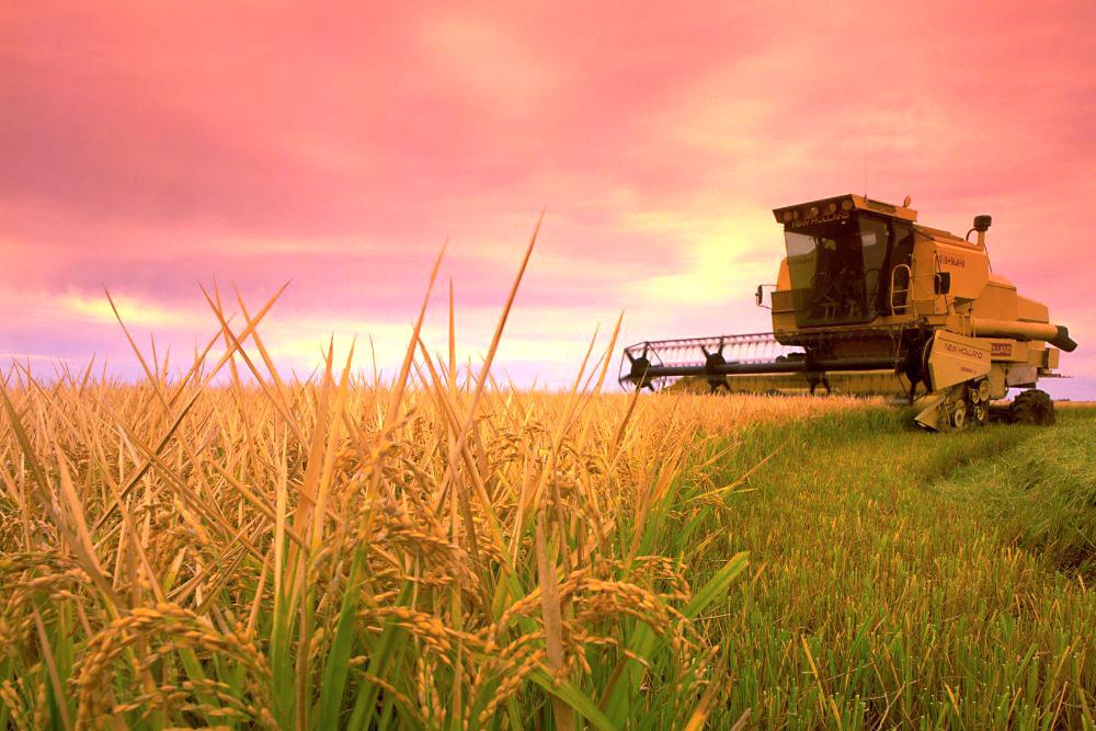 [Music plays and images move through to show various foods being cooked, a harvester working in a paddock, and a close view of a grain crop]