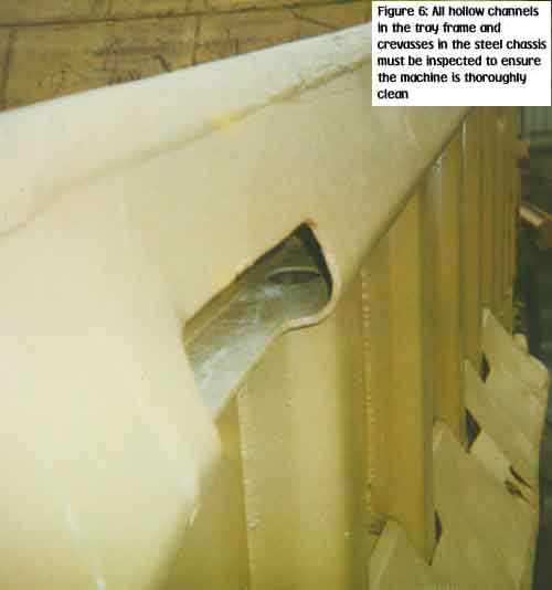 - Figure 6: All hollow channels in the tray frame and crevasses in the steel chassis must be inspected