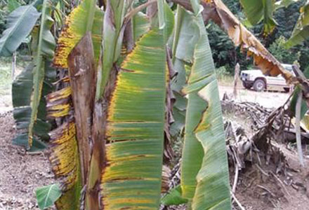 Look for banana plants with yellowing leaves that collapse into a skirt and discoloured stems.