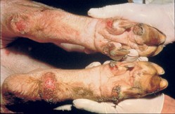 - blisters on the mouth, snout, tongue, lips or between and above the hooves on the feet; blisters may be intact or ruptured, exposing raw, painful tissue.